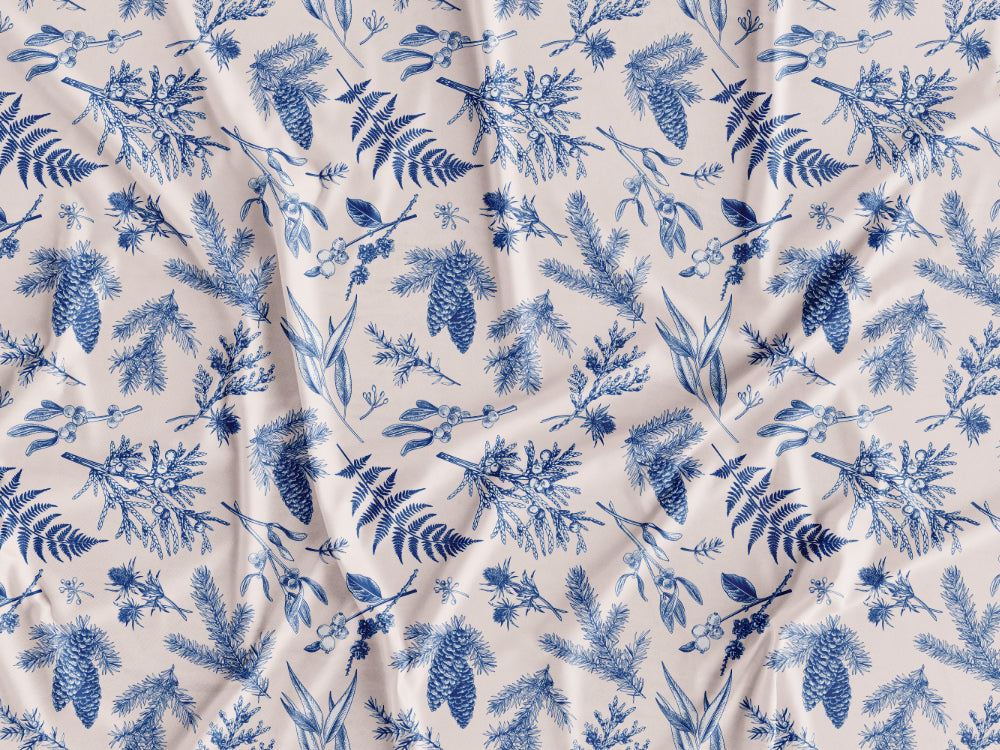 Tecido estampado com padrão de natal com arbustos e pinhas de vários formatos em azul sobre um fundo creme.