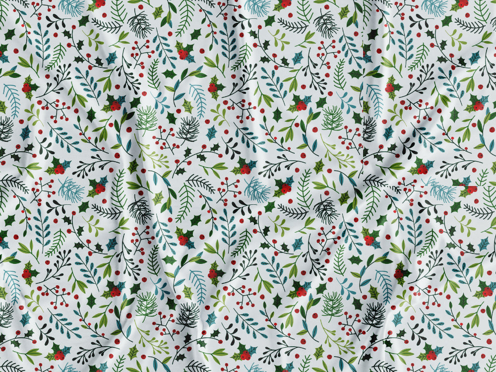 Tecido estampado com padrão de natal com azevinhos e outras folhas verdes sobre um fundo branco.