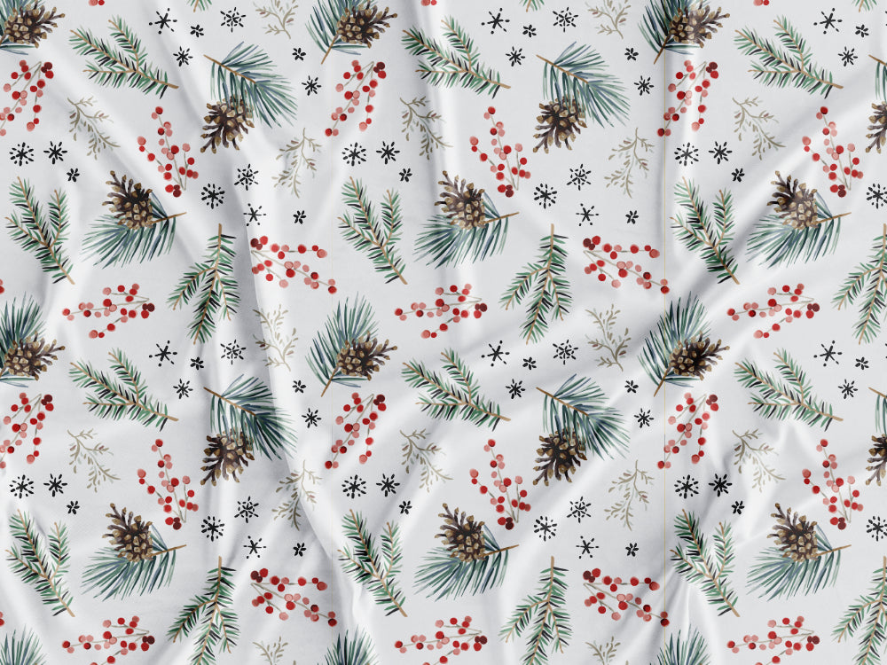 Tecido estampado com padrão de natal com azevinhos, caruma e pinhas sobre um fundo branco.