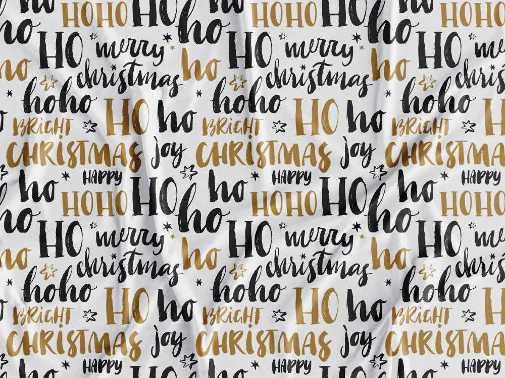 Tecido estampado com padrão de natal com palavras natalícias em dourado e preto sobre um fundo branco.