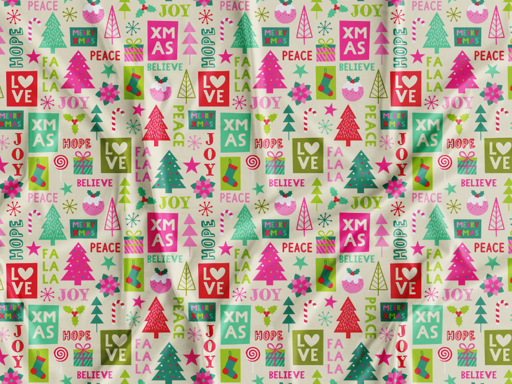 Tecido estampado com padrão de natal com arvores e palavras natalícias sobre um fundo branco.