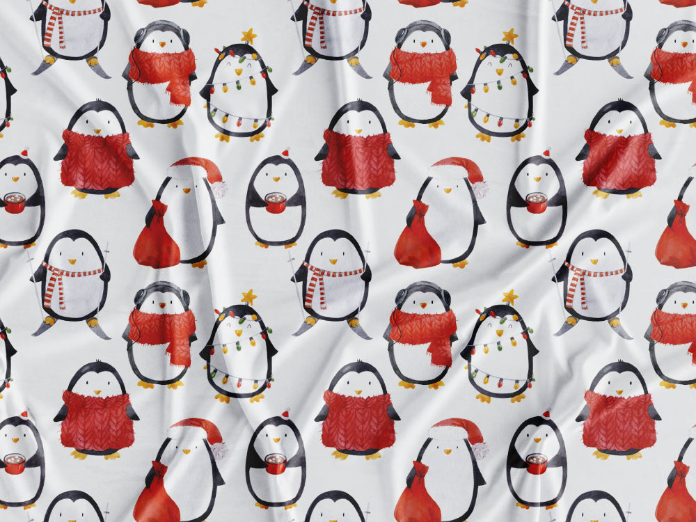 Tecido estampado com padrão de natal com pinguins com acessórios natalícios.