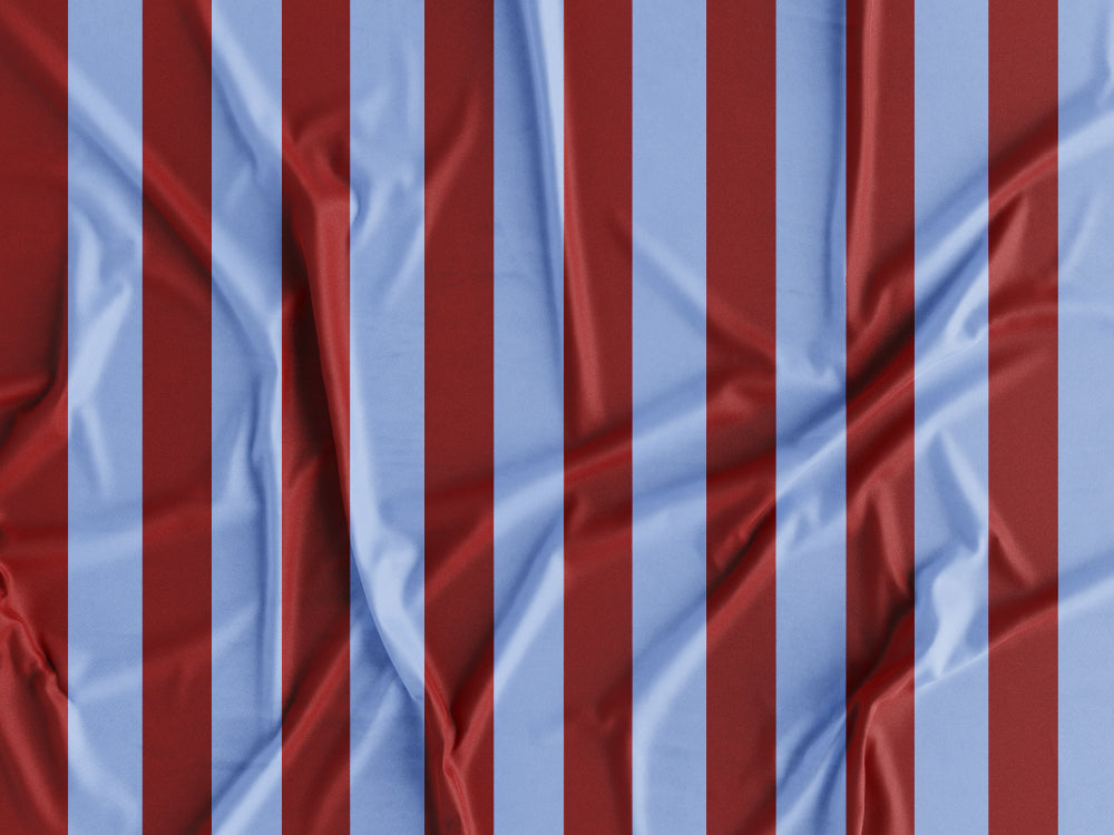 Tecido estampado com padrão de riscas bordô e azul. Riscas com 2cm.