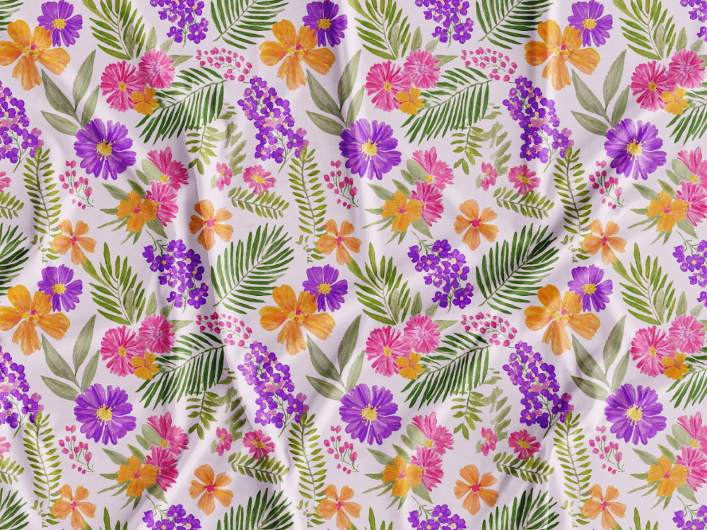 Tecido estampado com padrão de flores em tons de rosa, roxo e laranjas, sobre um fundo lilás.