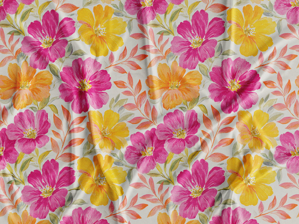 Tecido estampado com padrão de flores em tons de rosa e amarelo sobre um fundo bege.