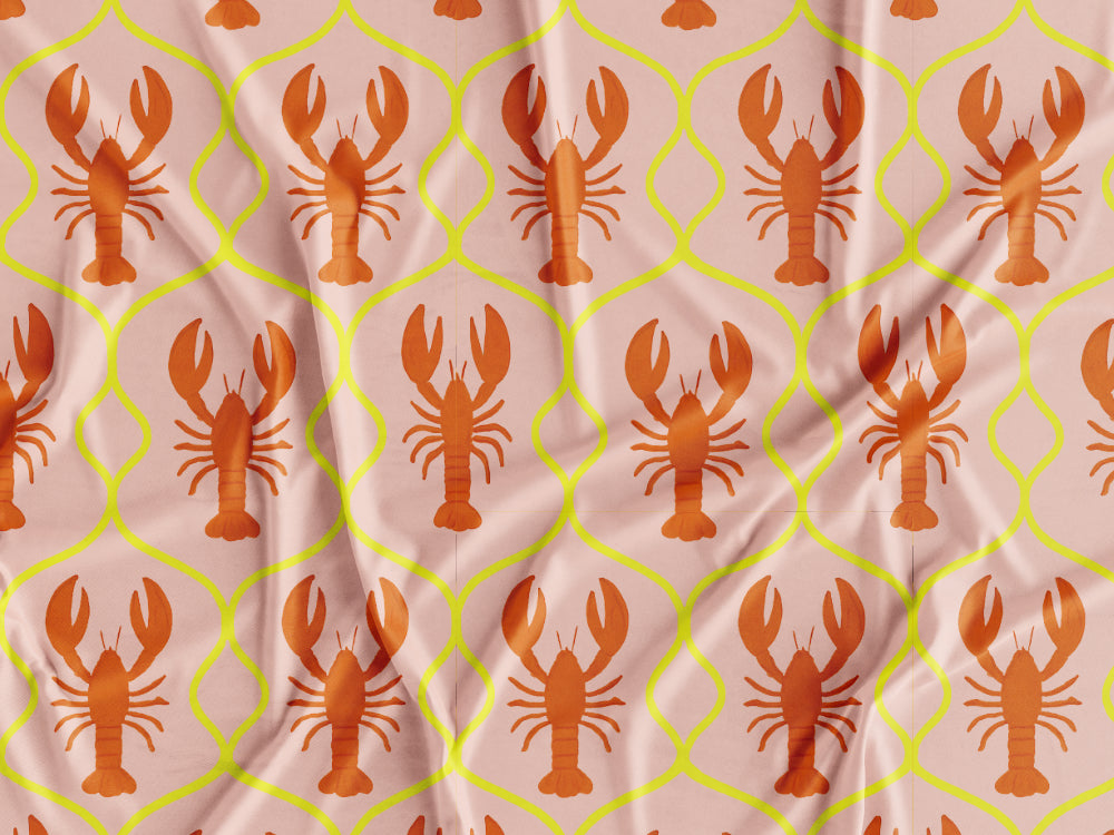 Tecido estampado com padrão com lagostas laranjas e fundo rosa claro.
