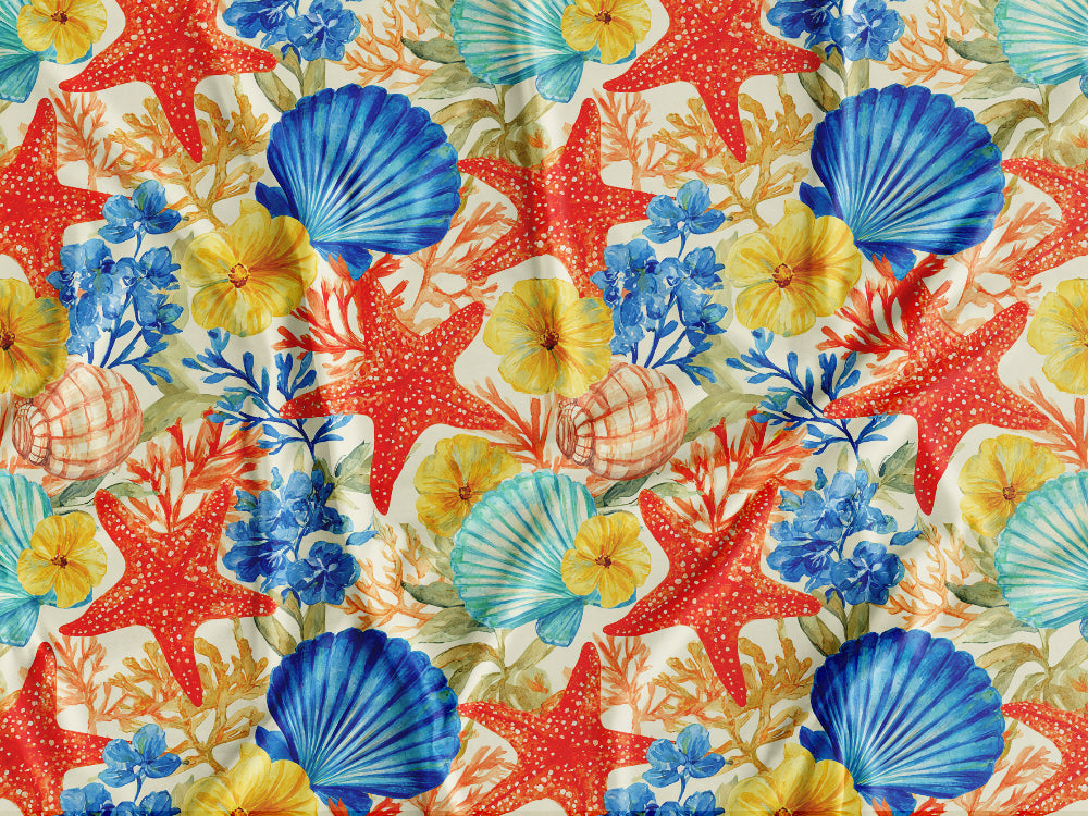 Tecido estampado com padrão com elementos do mar como estrelas, conchas e algas. Apresenta também flores amarelas.