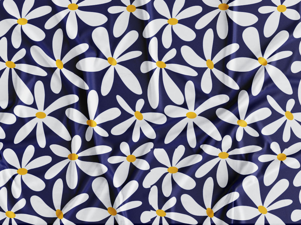Tecido estampado com padrão com malmequeres brancos e fundo azul escuro.