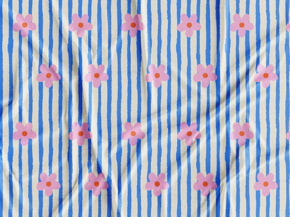 Tecido estampado com padrão de riscas em azul e branco com flores rosas sobrepostas. As riscas variam entre 0,8 e 1,2cm e as flores têm 4,4cm de altura.