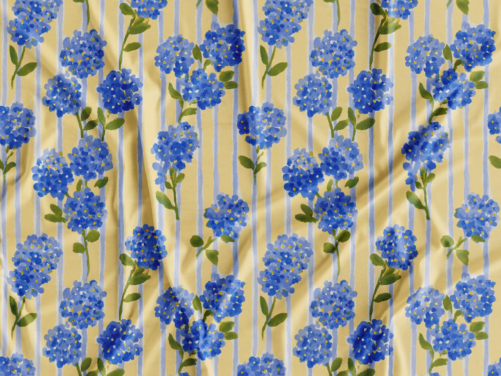 Tecido estampado com padrão com hortênsias azuis sobre um fundo de riscas azuis e amarelas.
