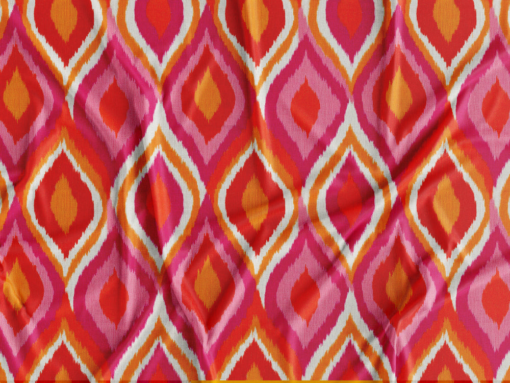 Tecido estampado com padrão geométrico em tons de rosa e laranja.