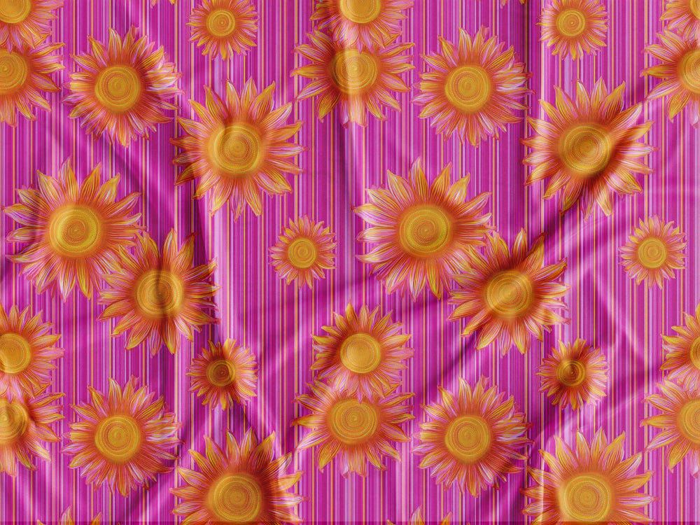 Tecido estampado com padrão de malmequeres amarelos sobre um fundo de riscas com vários tons de rosa.