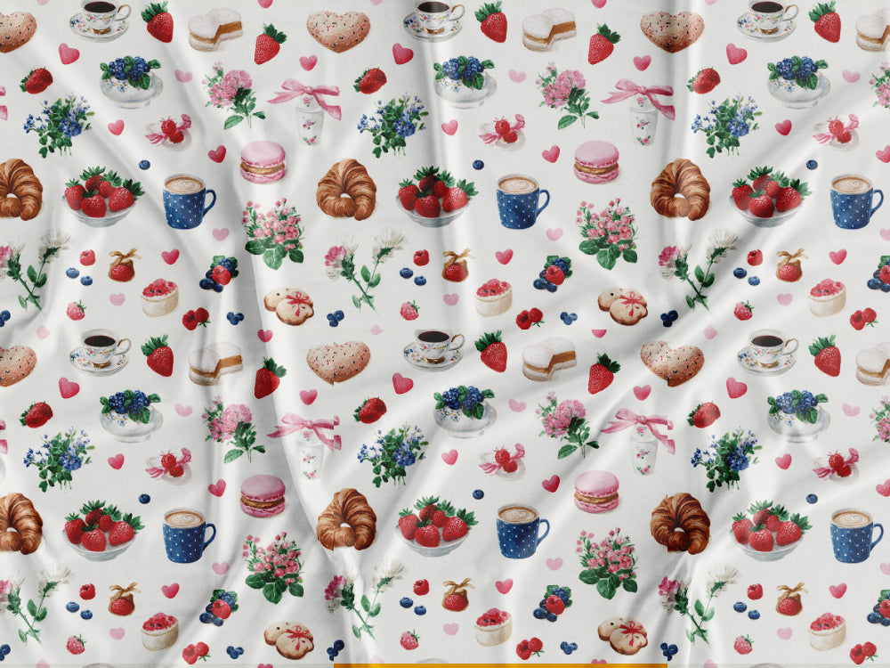 Tecido estampado com padrão estilo coquete com vários elementos.