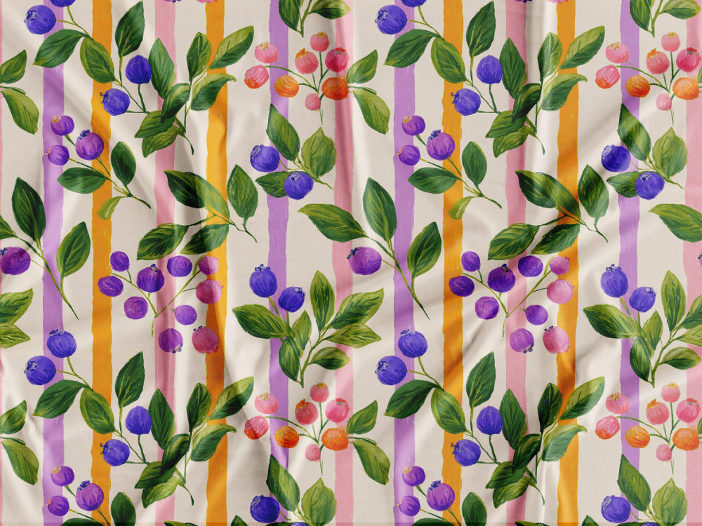 Tecido estampado com padrão com cachos de mirtilos e riscas bege, lilás e laranjas.