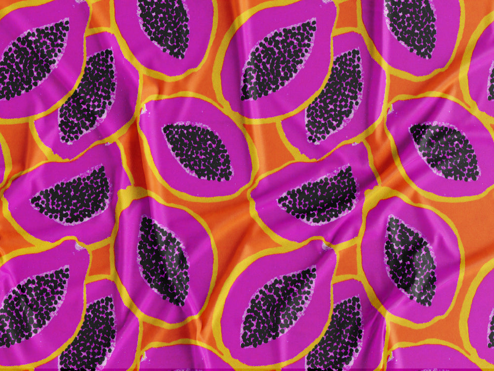Tecido estampado com padrão de papaias roxas sobre um fundo laranja.